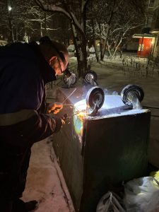 — Ремонт мусорного контейнера с заменой колеса с применением сварочных работ (ул. Кирова, 26, п.1).
